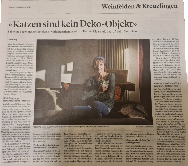 Mein Name ist Fabienne Nigro und ich bin leidenschaftliche Verhaltenstherapeutin für Katzen und Hunde. Mein Ziel ist es, Menschen zu unterstützen, die mit Verhaltensproblemen ihrer Tiere konfrontiert sind und ihnen die bestmöglichen Ansätze und Lösungen anzubieten.